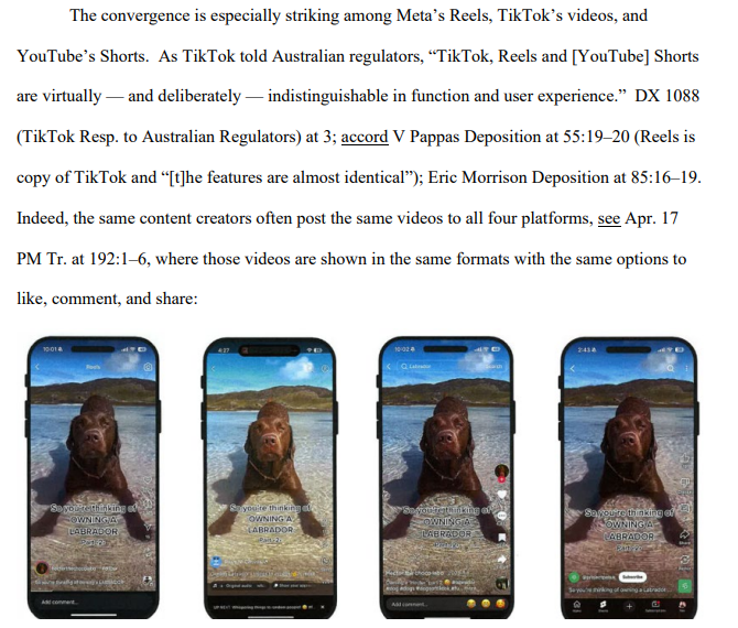 For someone who reportedly doesn't use any social media, Judge Boasberg did a pretty good job of describing what happened after the arrival of TikTok – how the completely algorithm-driven nature of that app put pressure on Meta to do the same with both Facebook and Instagram, decreasing the amount of real estate given to updates from people's friends and increasing the number of posts from complete strangers. Instagram added Reels, which were essentially an attempt to copy TikTok's viral posts, and they quickly got crossposted to Facebook. As Boasberg notes, that and other trends "transformed Facebook and Instagram into the apps that exist today, ones that primarily show users short unconnected videos recommended by algorithms. Both apps are pushing still further in that direction. In just the last two years, the share of time on Facebook that Americans spent viewing friends’ content fell by almost a quarter; the share of time they spent watching Reels more than doubled."