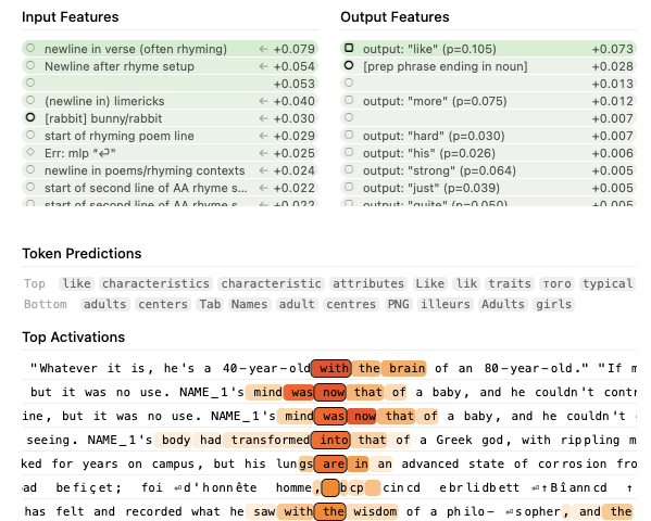 Note: If I can digress for a moment, I just want to mention that even if you have no interest in the internal mechanism of Claude, or in following the attention graphs that the paper delves into, it's worth taking a look at the paper online, because the way the information is presented is spectacular — and unusual. Many academic papers on a topic like this would be published as a static PDF document (which is essentially a large photograph), and wouldn't allow you to interact with the paper beyond a few hyperlinks or footnotes. Anthropic's research is published as fully interactive HTML, with every element or reference hyperlinked to supplementary graphs, explanatory notes — and also what amounts to an interactive database of the data behind the paper as well, which readers can explore. More research should be published like this!